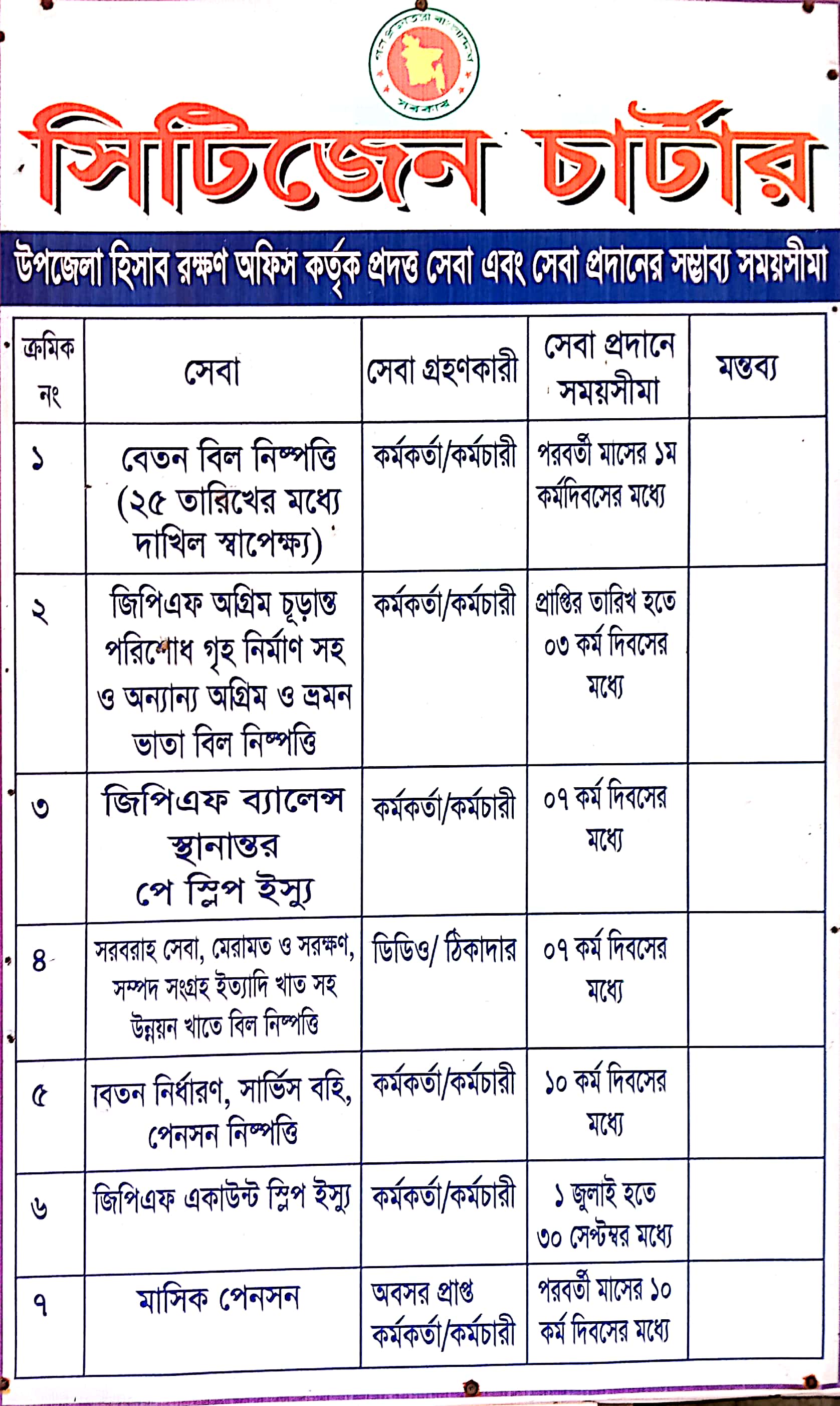 | সিটিজেন চার্টার | Fনিরীক্ষাধীন অফিসসমূহের কর্মকর্তা/কর্মচারীদের বেতন/ভাতার বিল পাশ, বেতন নির্ধারণ ও ছুটির হিসাব সংরক্ষণ। Fচেক ড্রইং ক্ষমতা সম্পন্ন দপ্তরসমূহের (যদি থাকে) কর্মকর্তা/কর্মচারীদের বেতন/ভাতা পরিশোধ। Fনিরীক্ষাধীন অফিসসমূহের সরবরাহ ও সেবা, মেরামত ও সংরক্ষণ এবং অন্যান্য খাতের বিল পাস। Fকর্মকর্তা/কর্মচারীদের জিপিএফ অগ্রিম/চুড়ান্ত পরিশোধ, বিভিন্ন ঋণ ও অগ্রিম, পেনশন আনুতোষিক পরিশোধ। Fসংশ্লিষ্ট সিএও অফিসের অথরিটির ভিত্তিতে অনুদান ও প্রকল্পের ছাড়কৃত অর্থের দাবী পরিশোধ। Fমন্তণালয়ভিত্তিক প্রাপ্তি এবং অনুন্নয়ন ও উন্নয়ন বাজেটের বিপরীতে ব্যয়ের হিসাব সংরক্ষণ এবং তার ভিত্তিতে মাসিক হিসাব প্রণয়ন। Fউপজেলা পর্যায়ের বিভিন্ন অফিসের হিসাবের সাথে ইউএও অফিসের হিসাবের সঙ্গতিসাধন। Fসোনালী ব্যাংকের সাথে প্রাপ্তি ও পরিশোধের ব্যাংক রিকনসিলিয়েশন। Fসরকারী কোষাগার জমাকৃত অর্থের চালান ভেরিফিকেশন। Fসিভিল অডিট কর্তৃক উত্থাপিত অডিট আপত্তি নিষ্পত্তির ব্যবস্থা গ্রহণ। |